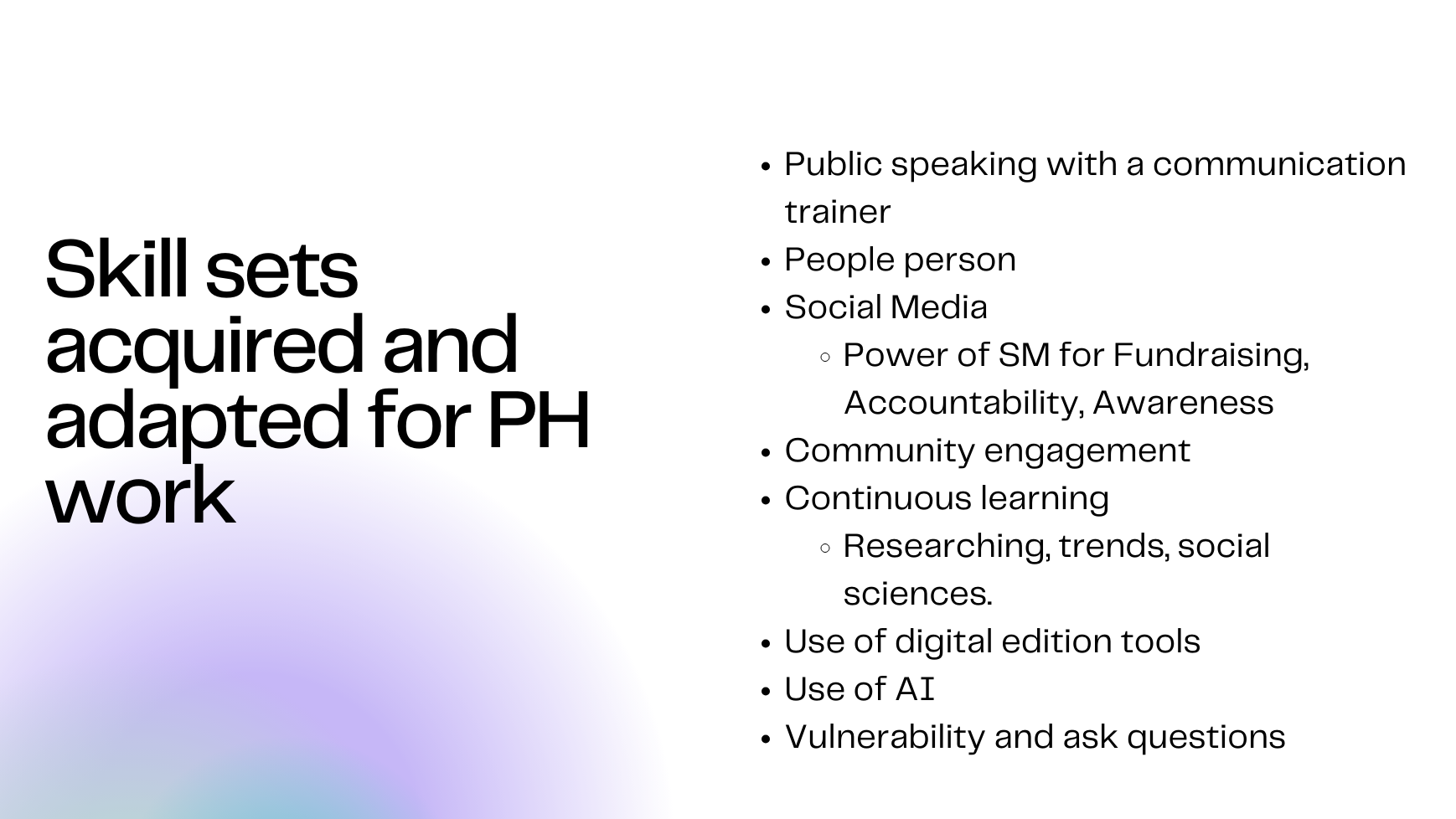 Below is a list of skills that I consider have been essential throughout my journey in Public Health Communications. These are based on my experience only and I continue to learn more as the world is constantly evolving.